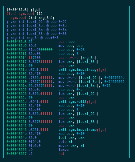 The functionality of the binary is pretty simple and we went through it in the previous post — It asks for user input, performs rot13 on the input and compares it with the result of rot13 on the string “Megabeets”. Id est, the input should be ‘Zrtnorrgf’.