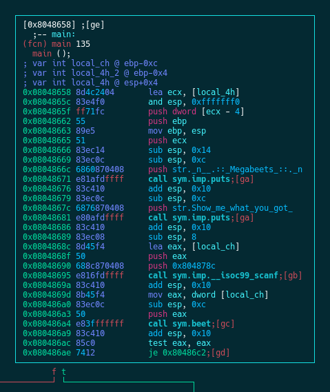 main() is the function where our program prompts us for input (via scanf() ) and then passes this input to sym.beet . By pressing oc we can jump to the function beet() which handles our input: