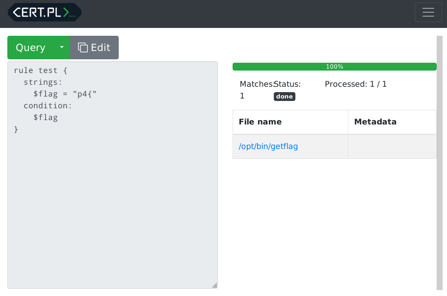 Let’s not move too fast and start from the beginning, the CTF challenge. On “Hidden-Flag”, the most solved challenge in this CTF, we are given an online instance of mquery, a “YARA malware query accelerator”. In other words, the system lets you run your Yara rules on a repository of files, very fast. The flag, as it seems, exists in the content of a file found the corpus of files that are indexed and scanned by mquery. As a malware researcher, and as a cert.pl old fanboy, I was already familiar with mquery and experienced with using it.