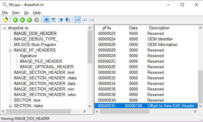 So what’s in this address? Use your favorite binary structure viewer to find out. In this example, I’ll use PEview but you can use any other program you prefer – including the binary structure parsing feature of radare2, if you’re already a radare2 pro (see pf?).