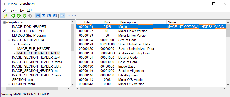 At address 0x00401cc0 we can see that NT_HEADER is moved to ecx and then the program is adding 0x18 to ecx. Last, the value in ecx is moved to [local_3ch]. Just as before, let’s open again our PE parser and check what is in NT_HEADER + 0x18. Adding 0x18 to 0x108 will give us 0x120. Let’s see what is in this offset: