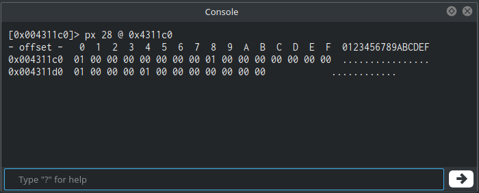 Double-clicking the resource will take us to the resource’s address. Let’s click on the Hexdump widget to see its data. In the hexdump we can see that this resource contains the following bytes: 01 00 00 00 00 00 00 00 01 00 00 00 00 00 00 00 01 00 00 00 01 00 00 00 00 00 00 00. Those of you who are familiar with radare2 may use the Console widget in the bottom left to do this quickly with px: