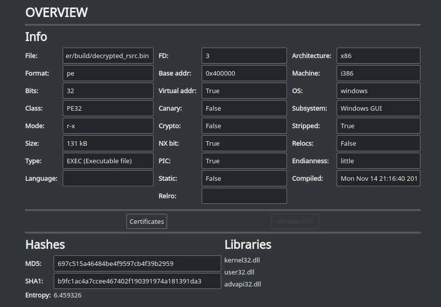 Seems like our script was executed successfully and “Saved the PE to ./decrypted_rsrc.bin”. Great!