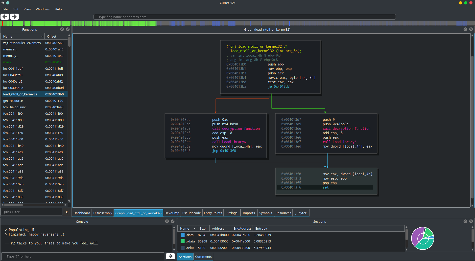 The last thing we want to do is to open decrypted_rsrc.bin in a new instance of Cutter in order to verify that this is indeed a PE file and that we didn’t corrupt the file in some way.