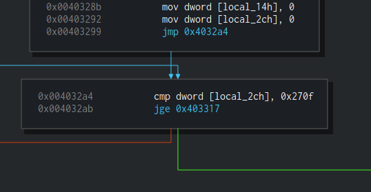 This loop is checking if local_2ch equals to 0x270f (Decimal: 9999) and if yes it exits from the loop. Inside this loop, there will be another loop of 999 iterations. So basically, this is how this nested loop looks like: