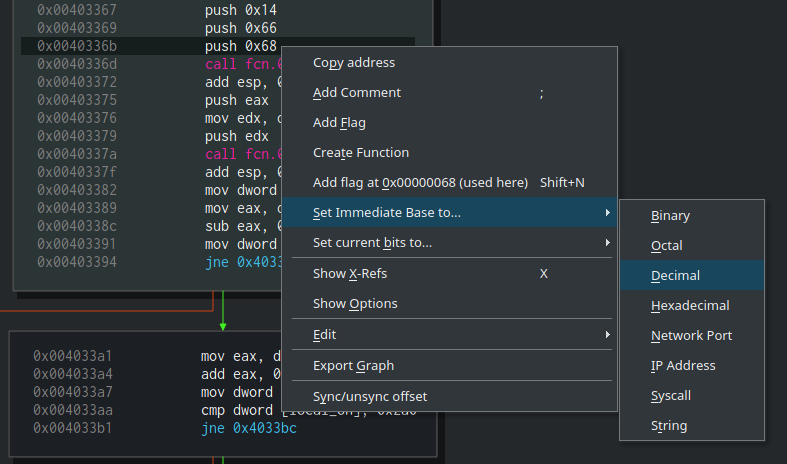 Right after the program is zeroing-out the allocated memory, we see a call to another function – fcn.00401c90. We can see 3 arguments which are being passed to it, 0x14, 0x66, and 0x68. Since sometimes we prefer to see decimal numbers and not hex, let’s use another useful trick of Cutter. Right-click on any of these hex numbers and choose “Set Immediate Base to…” and then select “Decimal”.