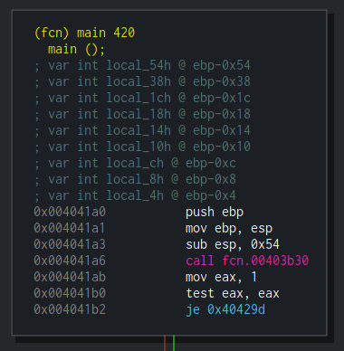 After main is calling to the AntiEmulation function, we are facing a branch. Here’s the assembly, copied from Cutter’s Disassembly widget:
