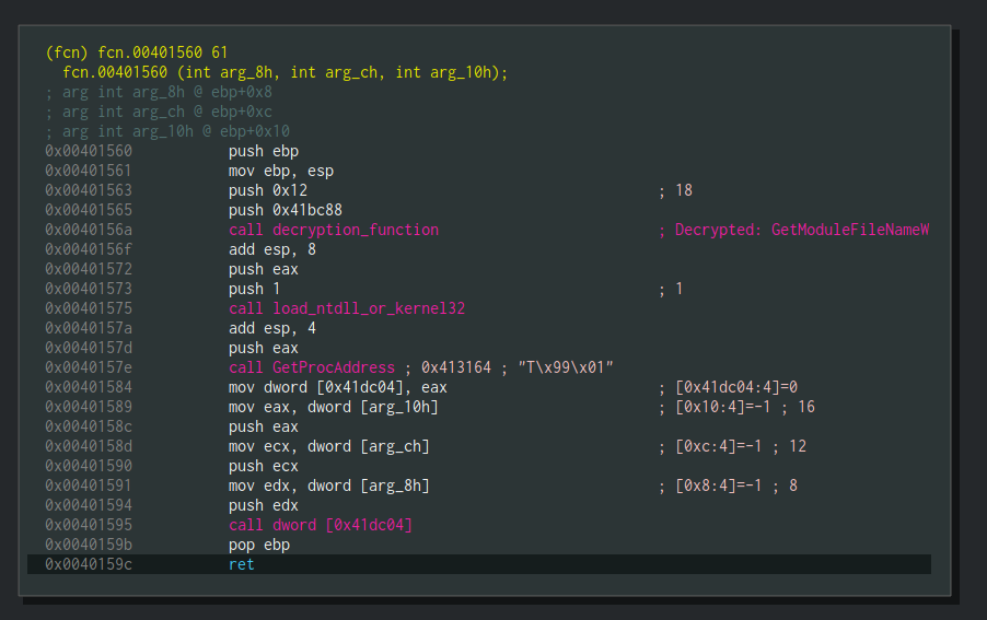 Hey! Look who’s back! We can see the 2 functions we analyzed in the previous article: decryption_function and load_ntdll_or_kernel32. That’s great! Also, you can notice the comment on call decryption_function which is telling us that the decrypted string is GetModuleFileNameW. This comment is the result of the r2pipe script we wrote.