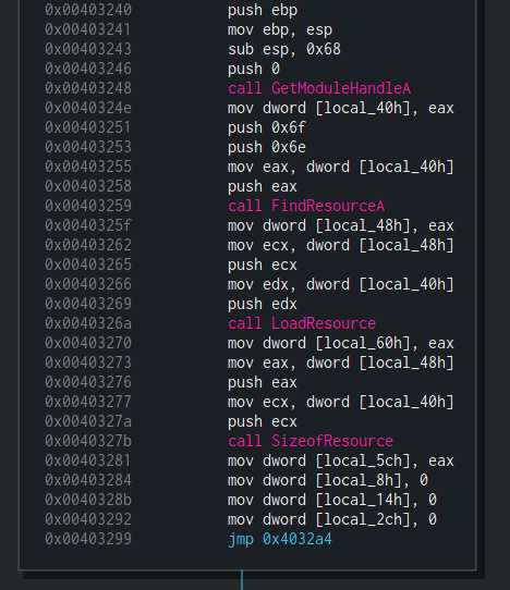The first block of fcn.00403240 is pretty straightforward. Dropshot is getting a handle to itself using GetModuleHandleA. Then, by using FindResourceA, it is locating a resource with a dummy type 0x67 (Decimal: 111) and a name 0x6e (Decimal: 110). Finally, it is loading a resource with this name using LoadResource.