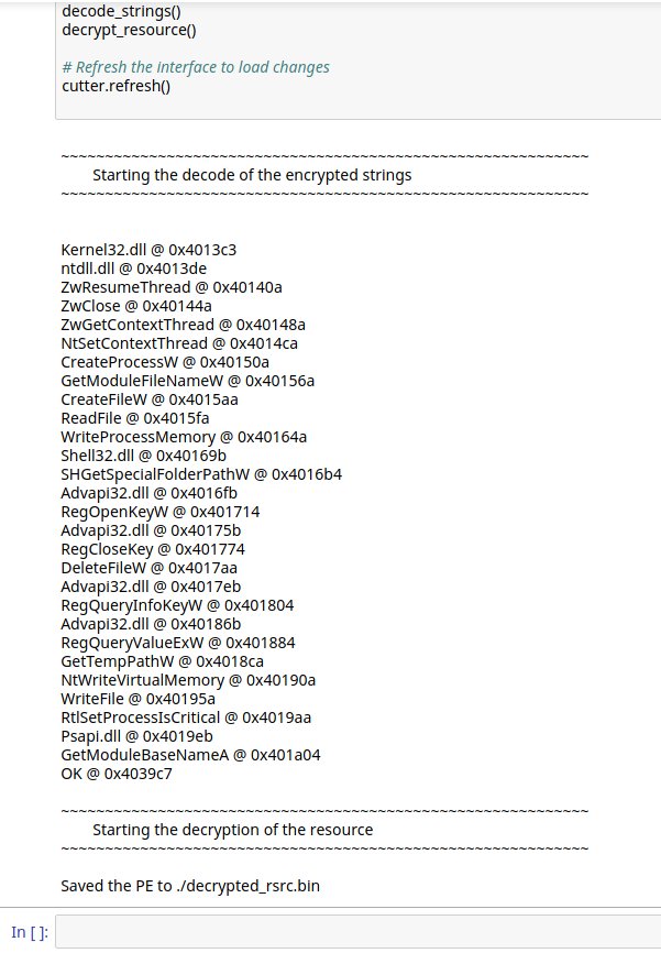 Now let’s combine the script from the previous article to the one we created now and test it in Jupyter. The combined script should first decode the encrypted scripts, and then it should decrypt the resource and save it to the disk.