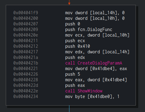The DialogPrc callback which is passed to CreateDialogParamA is recognized by radare2 and shown by Cutter as fcn.DialogFunc. This function contains the main logic of the dropper and this is the function that we’ll focus on. Later in this block, ShowWindow is being called in order to “show” the window. Obviously, this is a dummy window which would never be shown since the malware author doesn’t want any artifact to be shown to the victim. ShowWindow will trigger the execution of fcn.DialogFunc.