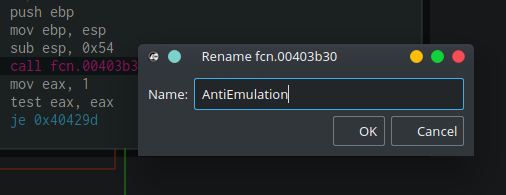 Now that we know all this, we can rename this function from fcn.00403b30 to a more meaningful name. I used “AntiEmulation” but you can choose whatever name you want, as long as it is meaningful to you. Clicking the call instruction and then pressing Shift+N will open the Rename dialog box. Right-clicking the row and choosing “Rename” will do the job as well.