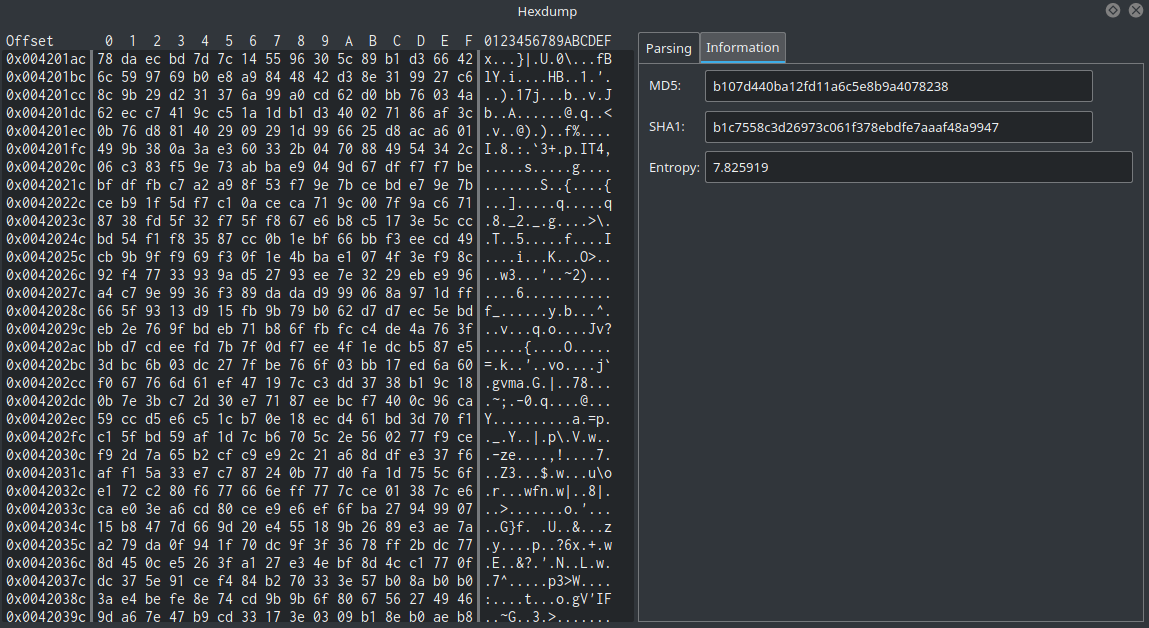 Remember the screenshot of the Resources widget from before? We can see there the resource named “101”. What makes “101” so interesting is that it is much bigger than the other — its size is 69.6 KB! This is Dropshot’s payload. By going to the Resources widget and double-clicking “101” will take us to the resource’s offset in the binary. In the Hexdump widget, we can see that the content of this resource makes no sense and has a really high entropy (7.8 out of the maximum 8):