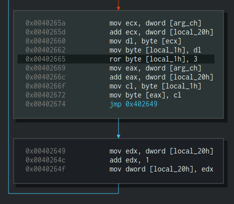 So how fcn.00402620 decrypts the decompressed payload? Simply, it uses ror 3 to rotate-right each byte in the decompressed buffer. 3 stands for the number of bits to rotate.