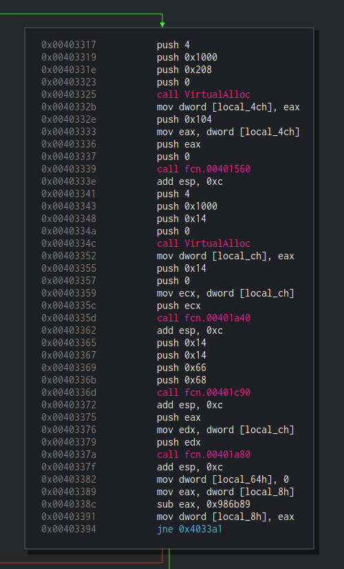 At first, VirutalAlloc in the size of 512 bytes is being called. Next, fcn.00401560 is called with 3 arguments. Let’s enter this function and see what’s in there: