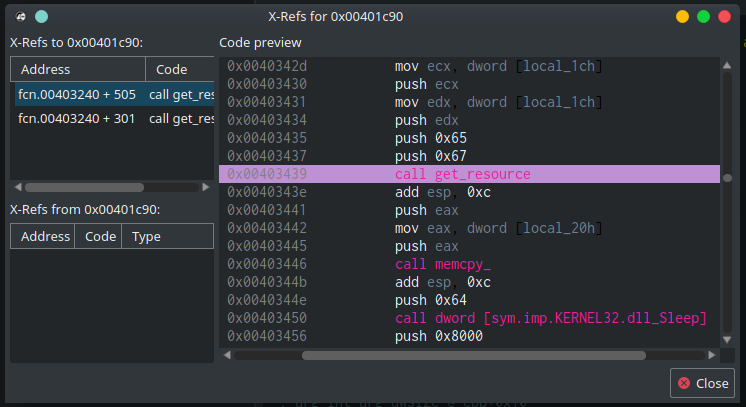 Now that we are sure about what this function does, we can see where else it is referenced. Right-click on the function and choosing “Show X-Refs” (or simply pressing ‘x’) will take us to the X-Refs window. We can see that get_resource is being called from two locations. One (0x0040336d) is already familiar to us, it is called to get resource “102”. The second call (at 0x00403439), a few instructions later, is new to us — it is called to get the content of another resource, named “101” (0x65).